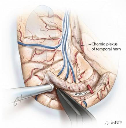 图7. 术中辨认脉络膜丛非常重要,是重要的解剖标志,因为所有位于脉络膜丛内侧的结构都属于间脑,在手术过程中需要加以保护。颞叶内侧切除缘上回的盖部,打开侧脑室的房部。脑室的位置被轮廓化。