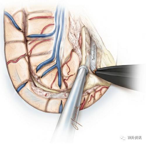 图14. 待最后的胼胝体压部,禽距,海马尾部,穹窿小柱,楔状叶,楔前叶都被分离后,继续向上分离至天幕的幕上部分。沿着天幕和大脑镰交汇的地方继续追溯可以更好的帮助外科医生沿着胼胝体压部来分离白质纤维。天幕的水平段和上升段以及大脑镰可以帮助手术者定位。