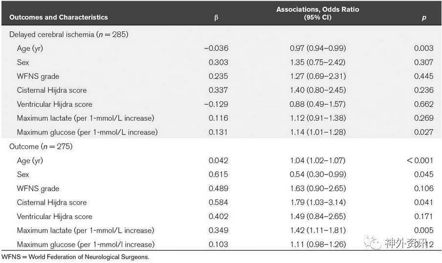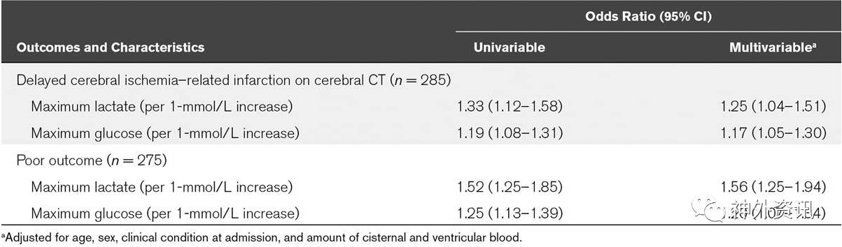 表3. 入院24小时内血乳酸和血糖的水平与迟发性脑缺血和预后不良的单变量、多变量分析。