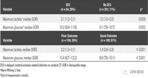表2. 入院24小时内最大血乳酸和血糖水平的中位数与迟发性脑缺血和预后的关系。