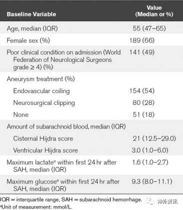 最后作者提出,在aSAH发病急性期内,较高的血乳酸和血糖水平与伴发迟发性脑缺血和预后不良相关。通过测定血乳酸和血糖水平的常规实验室指标,对识别、改善aSAH发病后并发症的发生和不良预后风险具有一定意义。