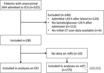 该研究收集285例于2006年11月至2011年12月在格罗宁根大学医学中心和鹿特丹伊拉斯谟医学中心诊治的aSAH患者资料,研究对象纳入和排除标准见图1。