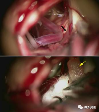 图16. 上图显示的是REZ区由于临近责任血管袢压迫造成的褪色区域(黑色箭头)。下图显示的是垫入Teflon之后的情况。请注意观察覆盖在VIII神经表面的罂粟碱浸泡的明胶海绵(黄色箭头)。