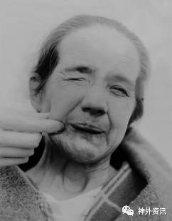 图1. Cushing的面肌痉挛患者(Circa 1920)。Cushing正在刺激患者右侧面部来触发痉挛。