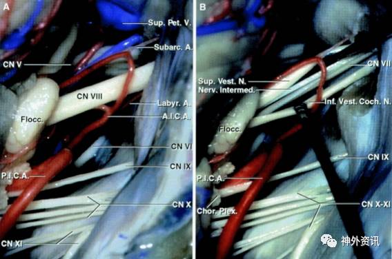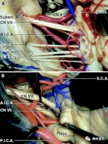 图4. 右侧乙状窦后入路暴露桥小脑角区颅神经。注意小脑前下动脉(AICA)和后下动脉(PICA)与VII/VIII神经的关系(A)。面神经位于前庭上神经腹侧。横跨VII/VIII神经的小脑前下动脉或其迷路分支通常并非责任血管,但在处理时候必须小心以免损伤后导致听力下降(B)(图片使用经AL. Rhoton, Jr授权)。