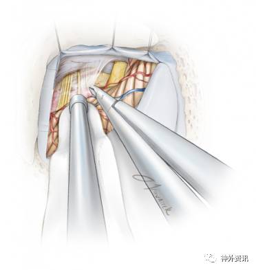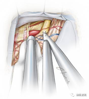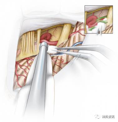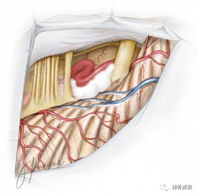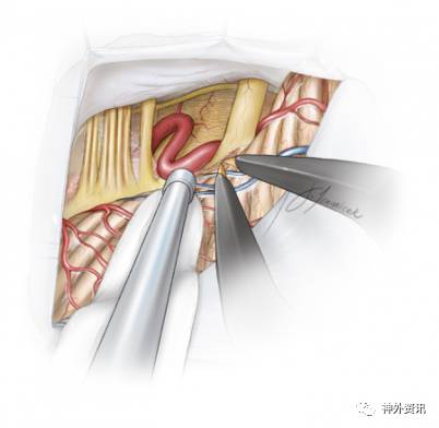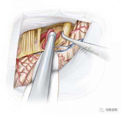 术中牵拉小脑时,为避免过度牵拉前庭蜗神经,应沿着舌咽神经方向进行牵拉。锐性地分离蛛网膜和动态牵拉小脑可在不损伤神经的前提下移动小脑。这些操作是充分暴露以利于移开责任血管及垫入Teflon的前提。