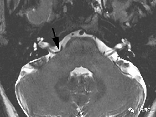 图2. 轴位MRI T2加权显示面神经REZ区血管袢(箭头)压迫。