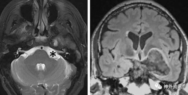 图3. 此巨大左侧岩斜区胆脂瘤(注意桥小脑角区面神经周围区域扩大)仅表现为同侧面肌痉挛。此病例通过乙状窦后入路和翼点入路分期切除。