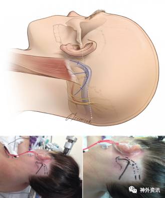 图6. 改良的反“U”型皮肤切口,切口顶点位于横窦乙状窦交汇处。注意图中患者头颅的位置和方向。