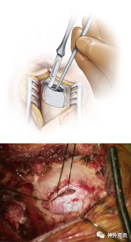 图19. 硬膜对合在一起即可,不必要水密缝合。在笔者患者中脑脊液漏的概率非常低,乳突气房用骨蜡封闭,还纳骨瓣或用人工材料颅骨成形,最后逐层缝合肌肉和皮肤。