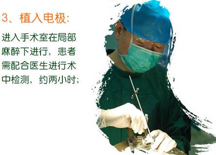 王学廉教授:脑起搏器疗法包括手术植入起搏器设备和术后程控两部分。手术包括:局麻下在病人头部安装立体定向头架,核磁共振扫描,图像传到手术计划系统计算靶点坐标,手术中电生理信号记录来进一步确定靶点位置,刺激电极植入目标靶点、体外临时电刺激观察患者肢体运动改善情况,临时电刺激有效证明电极植入位置准确,最后植入并连接脉冲发生器,手术结束。