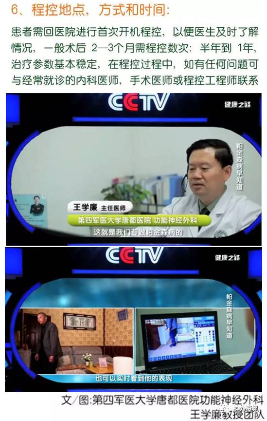 王学廉教授:术后一般1个月后开机,开机后的一段时间内需要寻找最佳的治疗参数,当然帕金森病是一个慢性疾病,需要患者根据自身的病情变化来院随访,现在也出现了无线远程随访系统。通过这个系统,患者可以在家和医生建立联系,完成远程随访,并通过无线远程系统进行程控。既能免除患者往返路途的奔波又能节约医疗资源。