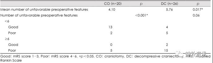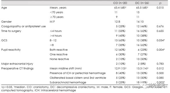 表2. 开颅手术与去骨瓣减压术的ASDH患者临床状况对比。
