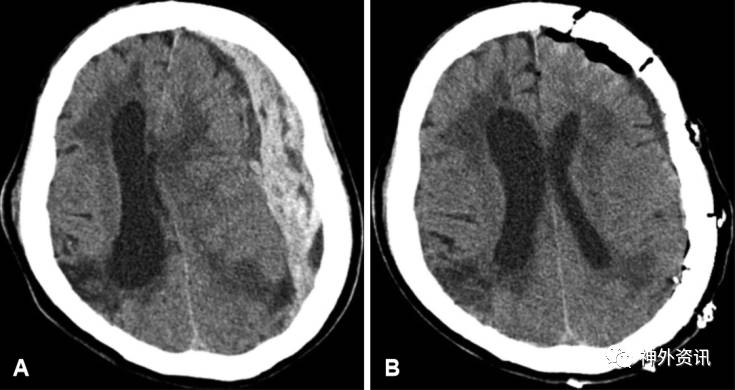 图1. 急性硬脑膜下血肿开颅手术术前(A)与术后(B)的CT扫描。