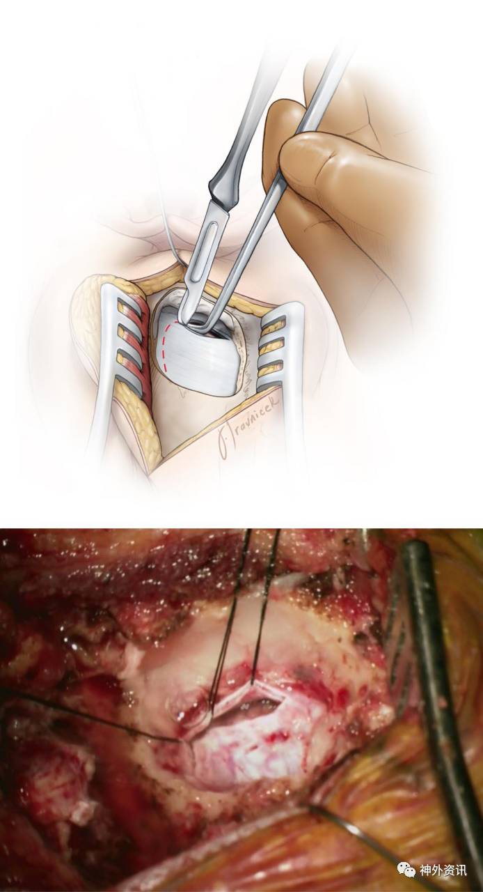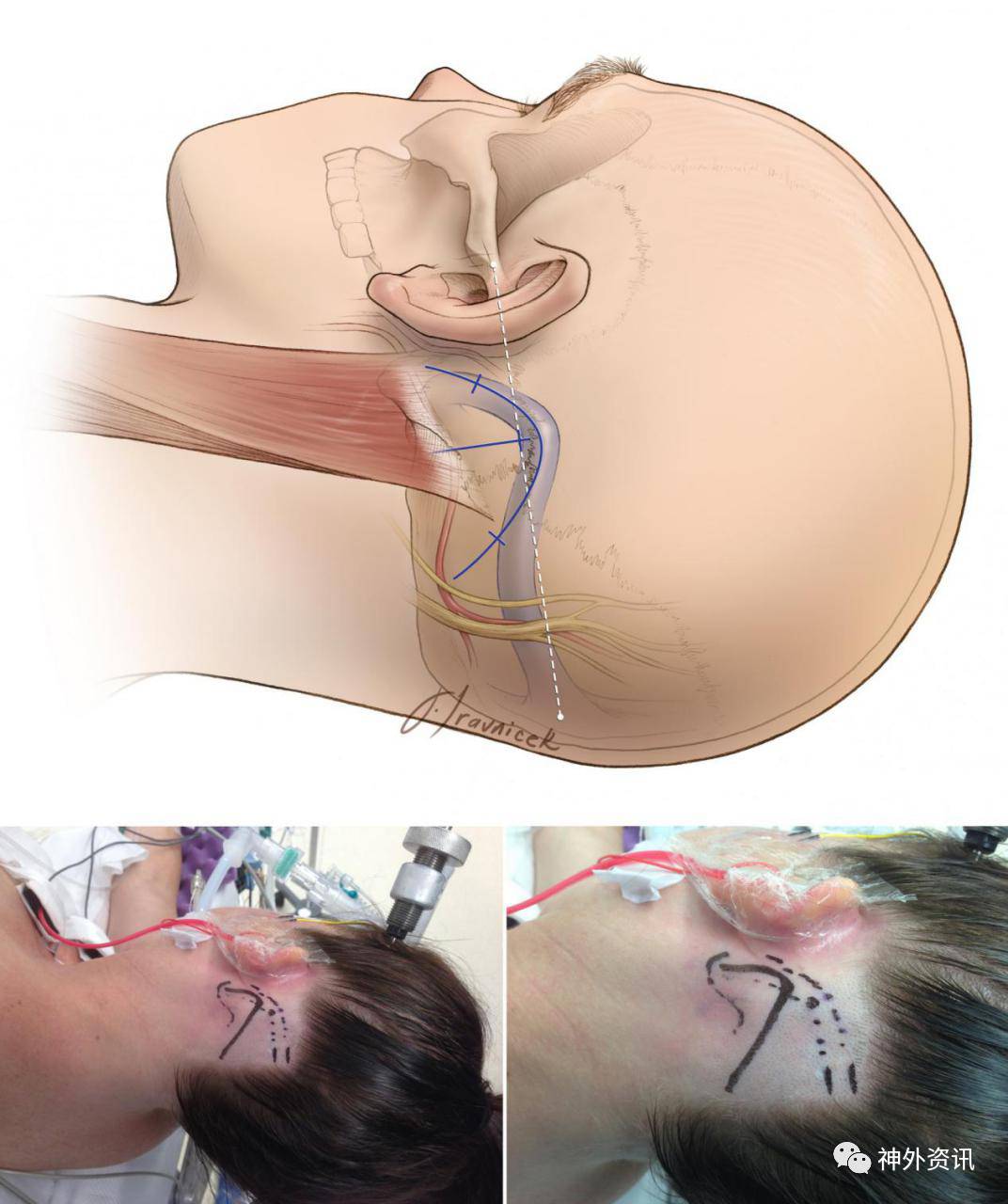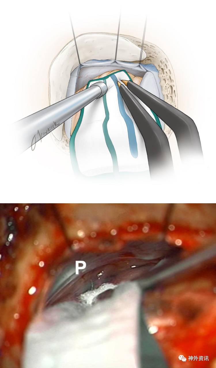 硬膜切开:硬膜的切开平行于乙状窦和小脑的基底部,横窦无需暴露,这种硬膜切开方式使得大部分脑膜与小脑贴附,从而减少光源下硬脑膜干燥、挛缩,而U形皮肤切口使得肌肉皮瓣缩向下,增加了工作的角度,缩短了术者的操作距离。