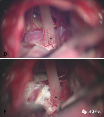 E:注意责任血管从神经纤维中穿出,垫上Teflon片后充分去除脑干附近的血管压迫。
