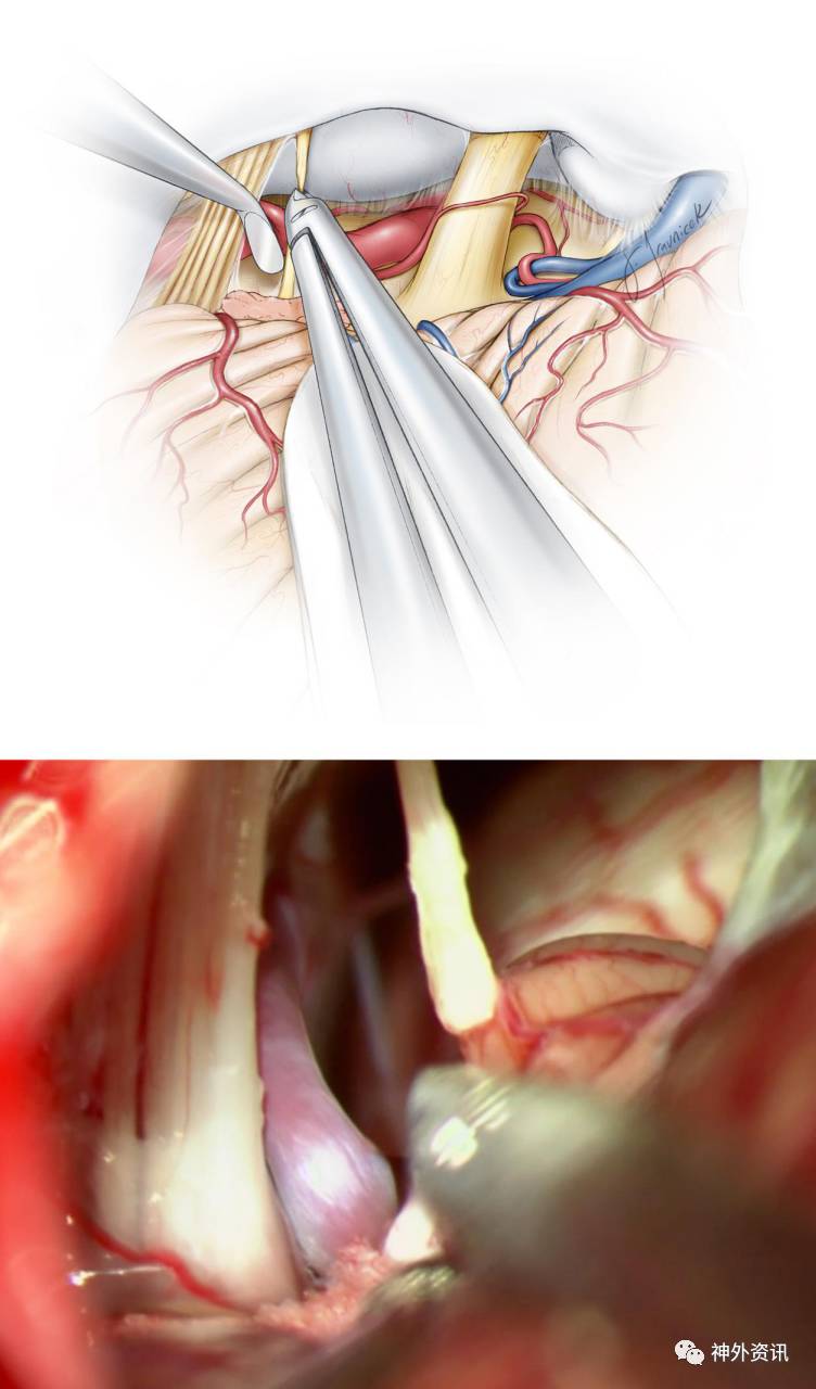 顺着脑干向下的方向推开迷走神经根部的责任血管袢。有人主张在无明显血管压迫的情况下,剪断迷走神经上方的1-2根根丝,但作者不建议这样做,因为剪断后出现声音嘶哑及声带麻痹的可能性大,经过术前的充分的评估,作者总能在迷走神经根部发现压迫的血管袢。
