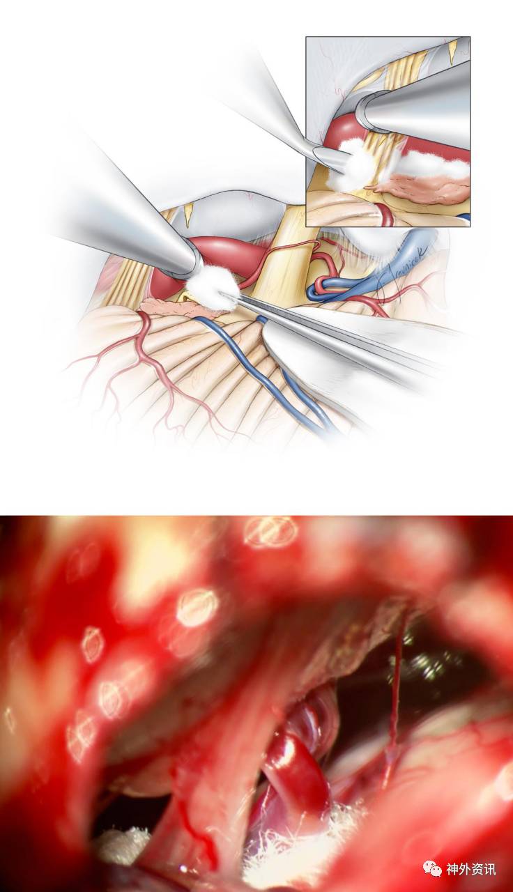 作者用很多Teflon棉垫在迷走神经上方和下方,以及在迷走神经平面上的血管袢与脑干之间放置Teflon棉,以做到充分的减压。有序的放置这些Teflon棉,可以防止血管袢返回原来的位置。但是过量的Teflon棉是不必要的,并可能产生炎性牵拉或化学性炎症。关于粗大的椎动脉的挤压,一般单纯的Teflon棉很难充分的垫开,关于报道的“硬脑膜悬吊”的方式固定血管,即把椎动脉悬吊后缝于岩骨的硬膜上,但因为狭小的空间,容易造成其他重要血管结构的损伤,故作者并不推荐这样的方式。作者多会尽量用Teflon棉垫开,在术前在MRI发现粗大的椎动脉压迫时,告知患者术后很可能疼痛不会完全消失。
