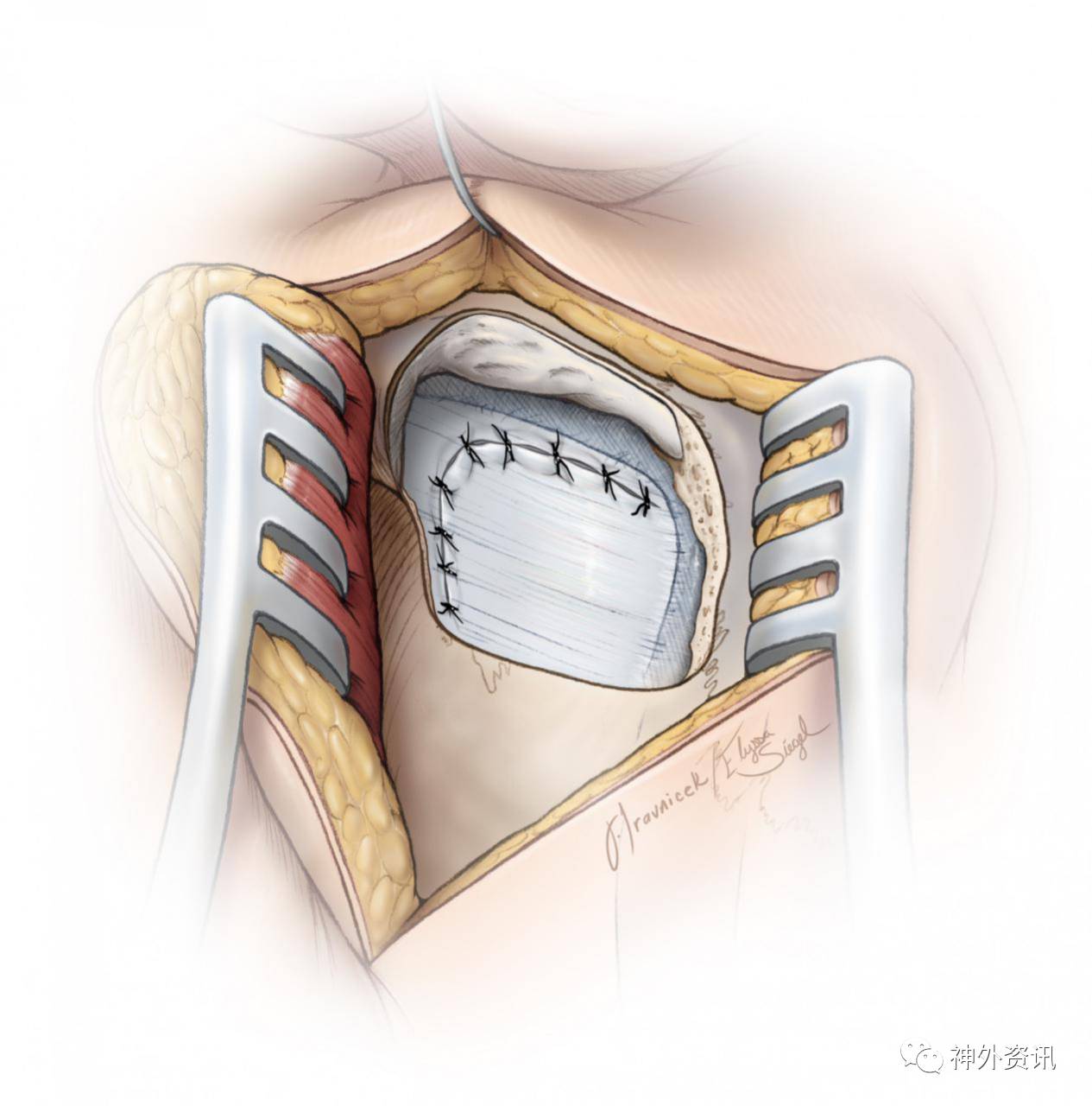 关颅:作者推荐间断缝合硬脑膜,不需要水密缝合硬脑膜,作者认为微血管减压手术发生脑脊液漏的几率较低(仅限于作者观点,一般经验还是要严密缝合硬膜,必要时肌肉+生物胶修补硬脑膜,防止术后出现脑脊液漏),对于乳突气房应该用骨蜡充分封闭(开颅封闭,关颅封闭),骨瓣回纳或行颅骨修补术,分层缝合肌肉及皮肤。