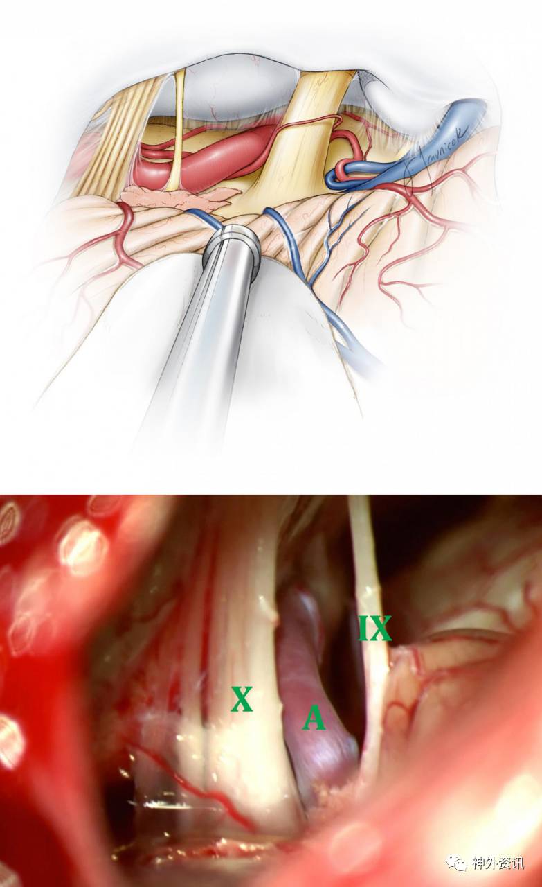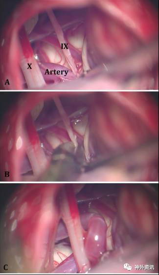 A:打开后组颅神经表面的蛛网膜后,发现血管压迫很明显。