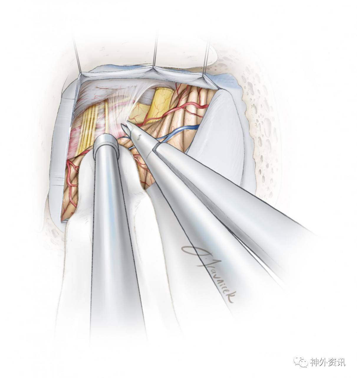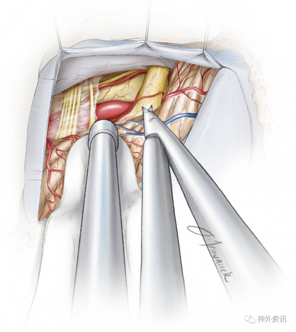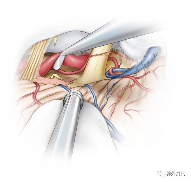 牵拉小脑的方向:应该避免单纯向内侧牵拉小脑,因为牵拉的方向深处为面听神经,容易伤及脆弱的面听神经导致听力受损。术者习惯从小脑绒球下方的小脑下外侧进入IX、X神经入髓区。