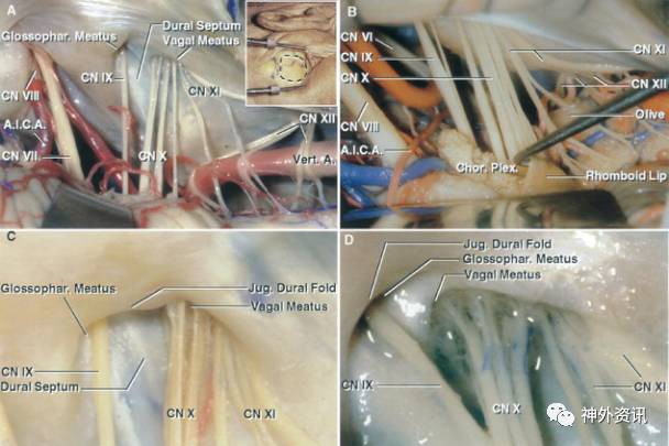手术相关解剖 A:右侧乙状窦后入路暴露枕骨大孔区,抬起小脑观察桥小脑角区颅神经及与椎动脉(VA)的关系。B:舌咽神经与脉络丛、菱唇的关系。C、D:枕骨大孔区分隔舌咽神经、迷走神经的硬膜。