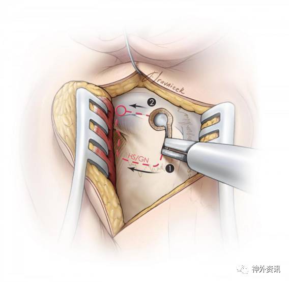 分离神经,电凝后在脑干近端切断舌咽神经, 在此之前,告诉麻醉师观察血流动力学变化,尤其对于老年患者。作者经验:舌咽神经切断后的并发症非常小,并能为迷走神经的充分减压提供空间。