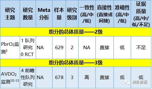 动静脉血氧含量差(AVDO2)。四个关于AVDO2监测的3级研究10-13组成了一个低质量的证据,支持一个Ⅲ级推荐。
