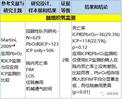 脑组织氧(PbrO2)监测。Martini等2009年做了一个回顾性研究,选取自2004年7月1日至2007年10月15日期间,收入到一个Ⅰ级创伤中心的所有严重创伤性脑损伤患者共629人。所有病人均进行颅内压监测,同时部分病人也应用Licox脑组织氧合探针进行监测。是否应用Licox由神经外科医生自主决定。这项观察研究是回顾性研究,分组不均(123例同时应用脑组织氧监测和颅内压监测,503例单独进行颅内压监测)。统计分析解释了组间不均等的样本数量的潜在影响,而进行额外监测的病人有更严重的创伤并且得到更细致的治疗。研究人员试图控制混淆变量(AIS分数,格拉斯哥昏迷评分【GCS】,以及Marshall头部CT分级),但也承认各组在预后方面或许有重要差异。鉴于这种不确定性和无效结果,对于支撑一个推荐而言,这个研究被认为是证据不足。