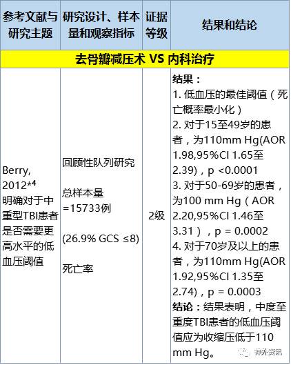 这项2级研究为提供间接证据的单一研究,作为III级推荐的支持证据,该研究包括中度和重度创伤性脑损伤(TBI)患者,但并未呈报不同损伤级别的结局。间接证据与来自低质量3级研究的直接证据相结合支持III级推荐。
