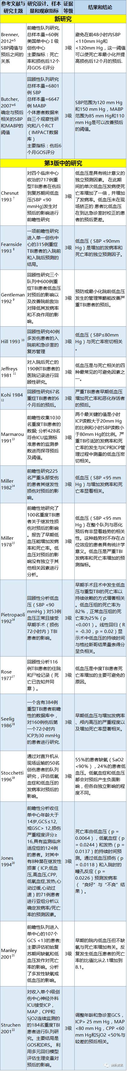 本主题阐述的问题是:为了提高严重创伤性脑损伤(TBI)患者的预后,SBP应达到或维持在什么样的水平。一项大型2级回顾性研究[4]和两项3级研究[5,6]被纳入。(表15-1)