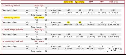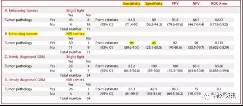 该项研究纳入15例胶质瘤患者,在肿瘤切除前按照5mg/kg的剂量注射“第二窗ICG”。通过NIR摄像头定位肿瘤,在肿瘤切除的过程中其边界达到可视化。术后通过神经病理学和MRI数据来评估NIR荧光成像的准确率。