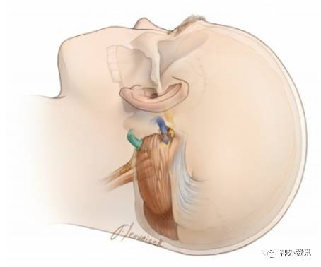 乳突后颅骨切开行前庭神经切开术类似三叉神经痛的微血管减压术。我的操作是经小脑上外侧入路暴露CN VII/VIII复合体。