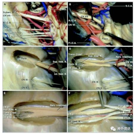 图2:这些图片说明了前庭神经和面神经、蜗神经的位置关系。注意蜗神经在CN VIII以下部分的特殊位置关系。