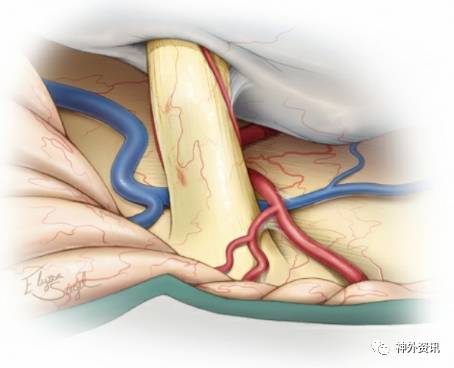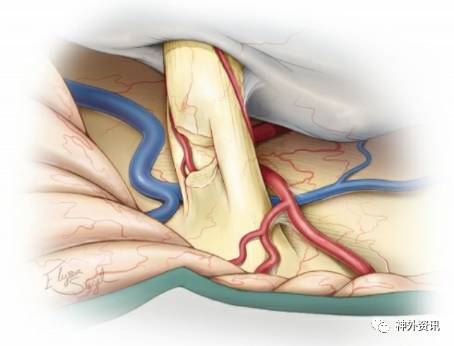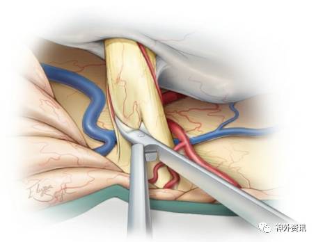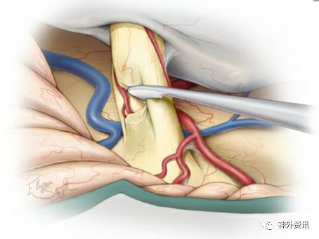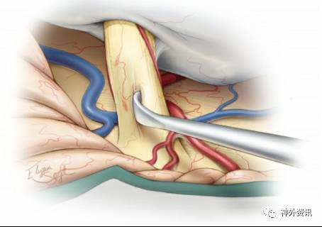 避免平行于CN VII/VIII的小脑中部牵拉,避免拉力直接传输造成神经牵拉。牵拉器平行于CN V和CN IX。需要注意的是,切开时,我没有使用固定的牵拉器,而是使用了吸入装置动态移动小脑半球。打开颅神经上局部蛛网膜,将听力损失的风险降到最小。吸入装置的动态牵拉仅仅使需要暴露的部位间歇暴露。固定牵拉器的硬性牵拉常常暴露不必要的部位。
