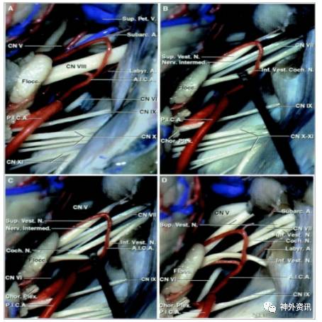 图1. 乙状窦后进入后,暴露小脑桥脑角内的颅神经。注意小脑下前动脉(AICA)和小脑下后动脉(PICA)与CN VII/VIII复合体的关系(A)。明确CN VII/VIII复合体内神经之间的关系是很重要的。面神经位于上前庭神经前侧(B)。分离器在蜗神经和下前庭神经之间(C)。分离上前庭神经和下前庭神经,暴露面神经和蜗神经(D)。AICA的迷路支也暴露。(感谢AL Rhoton, Jr提供图片)