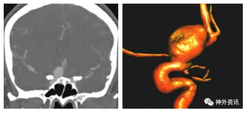CTA对于判断动脉瘤与骨性标记如前床突的关系上非常有帮助。而且它可以有效地评估动脉瘤在硬膜内的程度和是否需要治疗。