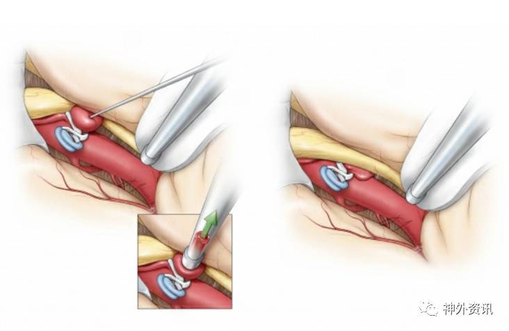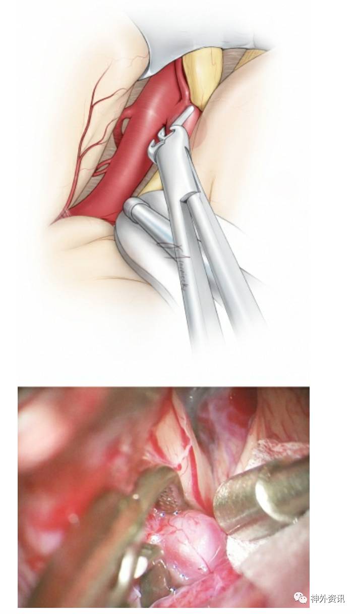 近端的控制可以通过颈内动脉临时阻断或颈外动脉和颈总动脉同时阻断来实现。夹紧颈外动脉和颈总动脉可以避免颈内动脉的损伤危险。尽管颈内动脉近端阻断,要是术中出现动脉破裂的情况时,经过后交通和眼动脉回流的血流也会很危急。