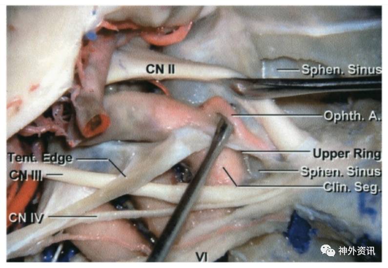 图2. 右侧颈内动脉的侧面观,图中已磨除前床突和海绵窦硬膜层。可见眼动脉位置,通常隐藏在视神经和前床突下方。颈内动脉眼段起始于硬膜远环(上环)终于后交通动脉起始处(图中不可见)(本图右AL Rhoton,Jr提供)