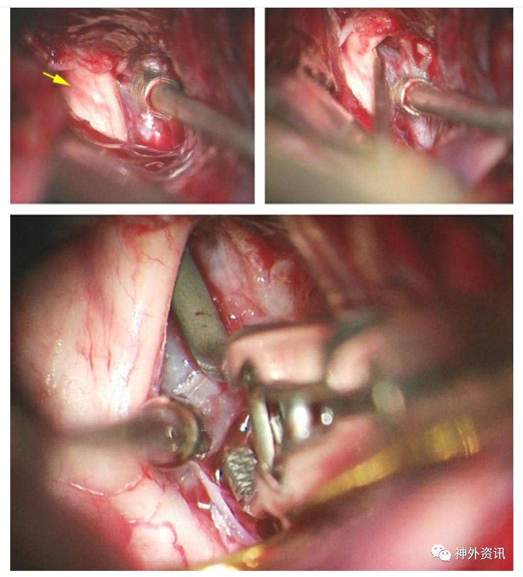 完全打开颅骨后切开硬脑膜前,先从硬膜外切除蝶骨翼内侧到床突外侧水平。待标准打开硬膜后,分开外侧裂可及颈内动脉,前床突和视神经。