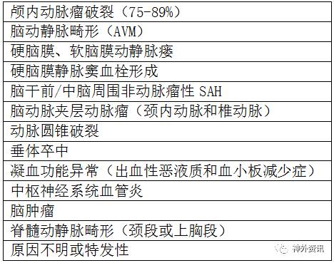 每年动脉瘤性SAH发生率达(6-8)/10万人口,可导致患者死亡和残疾的严重后果,死亡率高达45%。SAH的病因包括(见表1):