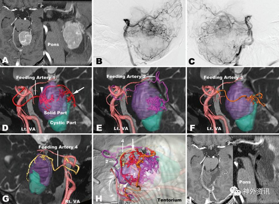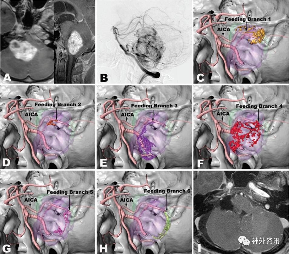 图3. 病例4的影像学资料和hr-3DMMI图像。A.MRI水平位和矢状位T1加权增强成像提示肿瘤位于右小脑半球前外侧部;B.DSA显示肿瘤供血动脉为右小脑前下动脉(AICA);C-H.hr-3DMMI清晰展示肿瘤由右小脑前下动脉发出的6分支供血;I.术后MRI水平位T1加权增强像显示肿瘤完全切除。