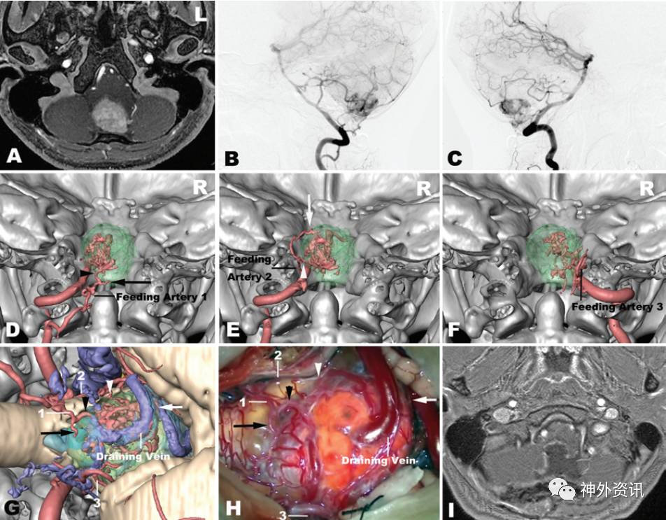图1. 病例2的影像学资料和hr-3DMMI图像。A.MRI水平位T1加权增强成像显示位于延髓背侧的血管母细胞瘤;B.DSA左侧椎动脉造影侧位片;C.DSA右侧椎动脉造影侧位片;D-F.hr-3DMMI显示肿瘤供血动脉;G.hr-3DMMI显示肿瘤供血动脉与周围结构毗邻关系;H.术中所见肿瘤供血动脉分布与术前hr-3DMMI一致;I.术后MRI水平位T1加权增强成像显示肿瘤全切除。