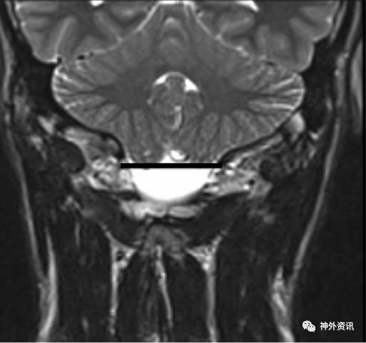 图1. MRI冠状位图像,水平线画在枕骨大孔的最低点;见小脑扁桃体下疝入枕骨大孔。