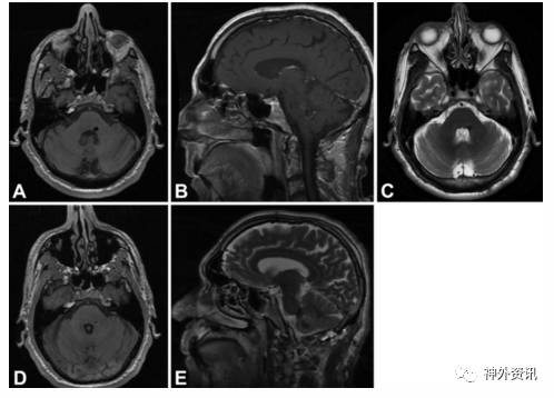 图3. 68岁男性患者的影像学资料。A-C.术前MRI-T1加权轴位、矢状位和T2加权轴位可见位于脑干背侧的海绵状血管畸形,处于面丘同一水平;D、E.术后MRI-T1加权轴位和T2加权矢状位显示病灶全切除。