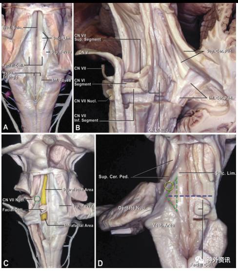 图1. 四脑室底面的上三角凹。A.界沟、外侧沟之间可见凹陷形成的上三角凹;B.面丘由外展神经核、面神经脑干段组成,小脑上脚构成四脑室的上外侧壁,小脑下脚构成四脑室的下外侧壁;C.面丘上方入路和面丘下方入路可用于处理脑干背侧病灶,绿圈所示为三叉神经运动和感觉核;D.界沟在面丘外侧加深并凹陷形成上三角凹,即绿色虚线所标。