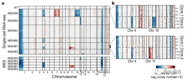 该项研究对6例含IDH1或IDH2突变、1p19q共缺失的Ⅱ级少突胶质细胞瘤进行单细胞测序。3例为深度测序,3例为中度测序。结果首先确认大部分测序的肿瘤细胞都含有1p19q共缺失的拷贝数变异(图1a),其中2例肿瘤可分为2种克隆亚型(图1b)。