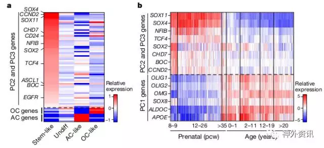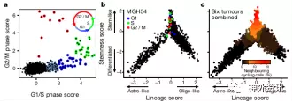 PCA发现PC2+PC3高表达,提示存在未分化的细胞。PC2+PC3最高表达的基因,包括对于神经干细胞和胶质瘤干细胞至关重要的神经发育转录因子SOX4、SOX11和SOX2,以及NFIB、ASCL1、CHD7、CD24、BODHE和TCF4(图2a)。聚类分析结果同样呈现类似的状况。Allen Brain Atlas提示PC2和PC3相关基因在出生前高表达,出生后表达降低(图2b)。同时,作者发现表达干细胞特征的少突胶质细胞瘤细胞往往是周期细胞,与肿瘤细胞的增殖、自我更新相关(图3)。最后,作者从拷贝数变异和基因点突变两个层面分析少突胶质细胞瘤的亚克隆,发现三个亚群中均含有不同程度的突变和拷贝数变异。因此,突变和拷贝数变异可能影响少突胶质细胞瘤亚群的形成。