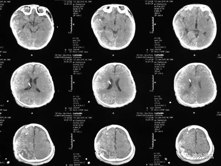 2017.2.4:术后5天复查颅脑CT,结果示中线居中,左侧半球及环池显示清晰,右侧半球脑沟显示欠清晰,脑组织低密度较前有所好转,继续同前治疗。已加用预消化肠内营养液及促进胃肠动力药物。