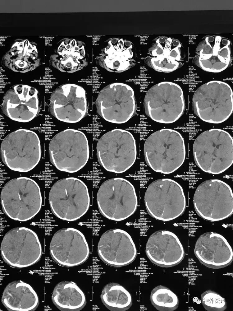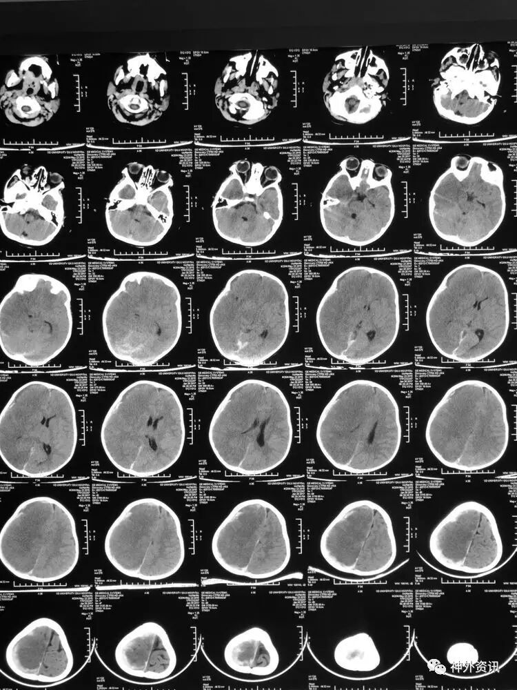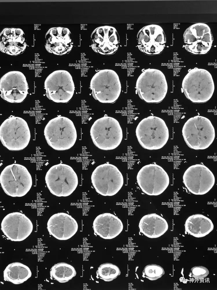 患儿刘**,男,19个月,2017.1.30 2pm不慎摔倒,意识障碍,刺痛不睁眼,不发音,刺痛肢体屈曲,急至当地医院,伤后1小时颅脑CT结果示右额颞顶枕急性硬膜下血肿,中线轻微左移:
